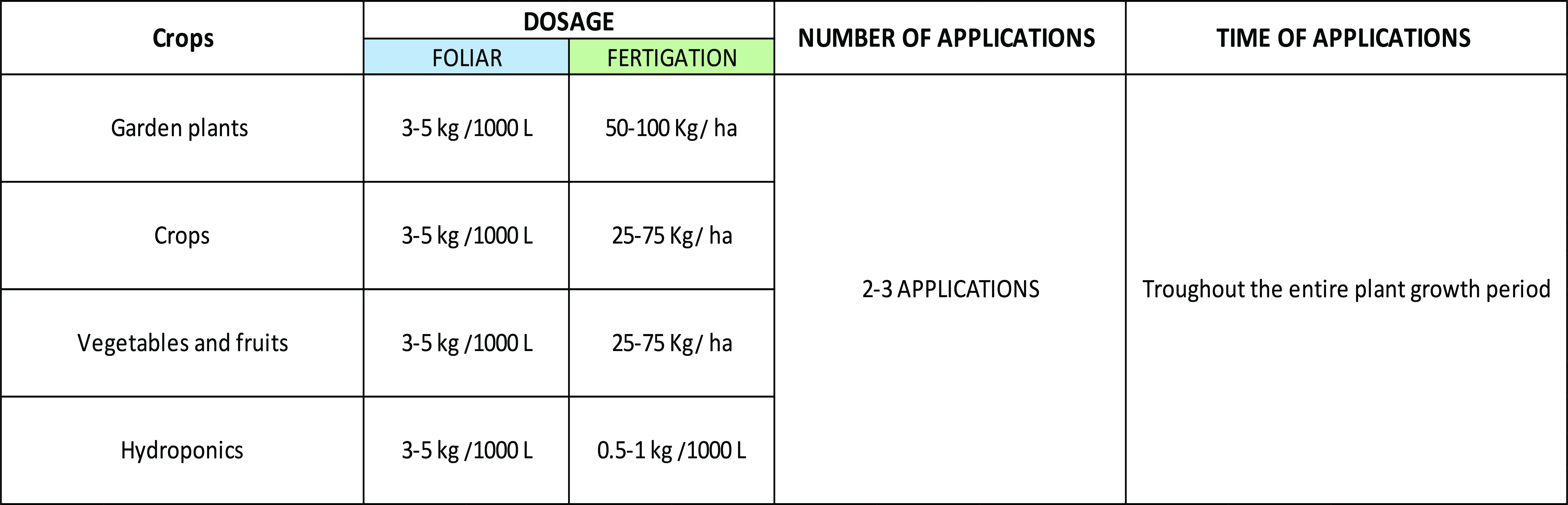 Please consult the technical services for application advice in specific crop and pedoclimate conditions. It is recommended to prepare a mixture in a smaller volume for testing before the main mixing. The dosage and frequency of use vary based on the product's needs and the characteristics of the soil. Store at a temperature below 25 degrees Celsius. This fertilizer contains chlorine (Cl) and its use is not recommended for plants sensitive to chlorine and salinity. FIMACO is only liable for the composition and has no responsibility for improper use of the products.