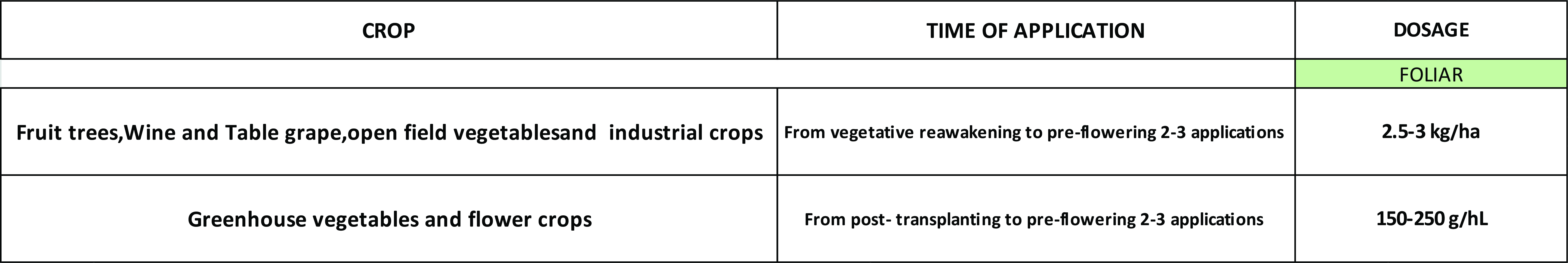 DOSAGES ARE CALCULATED FOR NORMAL WATER DISTRIBUTIONS VOLUMES. Please consult the technical services for application advice in specific crop and pedoclimate conditions. 36.6.6 can be mixed with all common formulation, except with mineral oils, emulsions, and Bordeaux mixture. If you want to use 36.6.6 in a mixture with other products, tests of compatibility on a small area are recommended. FIMACO is only liable for the composition of the product and assumes no responsibility whatsoever for damages caused by wrong/improper use of this product. Keep away from flames in a cool, well-ventilated place. Avoid prolonged exposure to low temperatures. Check the container periodically. In case of accidental spill contain the leak, avoid water contamination and whenever necessary, dispose according to the laws in force.